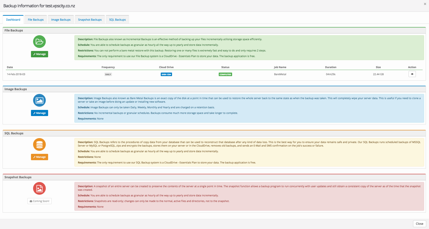The VpsCity Backup System offers easy to use File Level Backups, Image Level Backups and Snapshot Backups for your server. You can schedule backups as granular as hourly all the way up to yearly and store data incrementally. Our backup system provide single click server restore process and alert notifications for success or failed backups.
